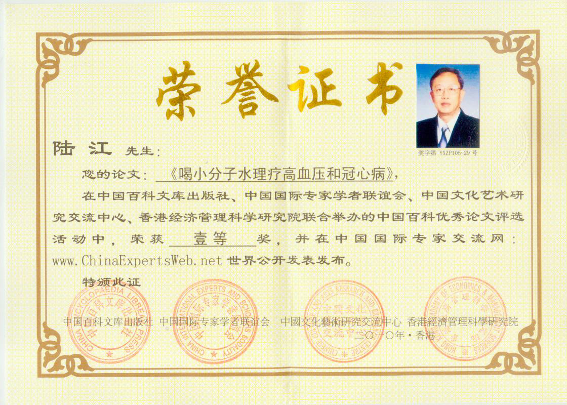 -----我是從事建筑的高工,本來沒有資格去攻克醫(yī)學(xué)難題,卻為了自身健康才扣響醫(yī)學(xué)的大門。由于我1990年患高血壓,因怕中風(fēng)才研究發(fā)明了離子水瓶,我把水處理成微小分子團(tuán)水,飲用后治愈了高血壓。便于1993年底送到三家省級(jí)醫(yī)院做臨床試用4個(gè)月。經(jīng)北京和廣西醫(yī)學(xué)專家鑒定:"降脂降壓效果好"," 能擴(kuò)大心腦動(dòng)脈流量,改善心腦電圖以及微循環(huán)","對(duì)治療心腦動(dòng)脈粥樣硬化、高血壓、高血脂有良好的醫(yī)療保健作用。""產(chǎn)品的技術(shù)性能和療效達(dá)到了同類產(chǎn)品的國(guó)內(nèi)領(lǐng)先水平,經(jīng)廣西醫(yī)學(xué)科學(xué)情報(bào)研究所檢索,未見國(guó)外有類似報(bào)道。"中國(guó)醫(yī)學(xué)科學(xué)院張正國(guó)教授從美國(guó)國(guó)立醫(yī)學(xué)圖書館數(shù)據(jù)庫(kù)存Medline檢索英俄文資料,均未見類似報(bào)告。2000年上市后,我為了對(duì)消費(fèi)者負(fù)責(zé)而繼續(xù)觀察研究,一直通過《信譽(yù)卡》和《質(zhì)量跟蹤調(diào)查書》向患者承諾療效,請(qǐng)用戶使用6個(gè)月后反饋效果。和脂壓患者飲用2至5個(gè)月內(nèi),消除癥狀,停服藥物,血壓正常;冠心病患者飲用3~5個(gè)月逐漸減輕至消除心絞痛、房顫等癥狀,不再服藥,飲用1年左右心電圖正常,經(jīng)冠脈造影掃描無(wú)明顯狹窄,表明冠心病痊愈。大量患者還反映許多衰弱器官被修復(fù),讓前列腺增生、慢性咽喉炎、慢性氣管炎、支氣管炎、慢性胃炎、腸炎和膽囊炎等不藥而愈;2型糖尿病患者是因?yàn)橐葝u衰弱致病,飲用該水半年至一年,逐漸減藥至停藥,血糖尿糖正常,真正治愈2型糖尿病。中風(fēng)后遺癥患者飲用六七個(gè)月,可逐漸減輕至消除肢體和語(yǔ)言障礙,表明飲用該水能讓壽命很長(zhǎng)的神經(jīng)元細(xì)胞逐漸修復(fù),奇跡般地恢復(fù)肢體和語(yǔ)言功能。飲用后還使胸腺和脾臟兩個(gè)重要的免疫器官被修復(fù)和增強(qiáng),產(chǎn)生免疫細(xì)胞多,提高了免疫力,使人不生病或少生病。自此, 飲用微小分子團(tuán)水創(chuàng)造了攻克冠心病、高(低)血壓和糖尿病三大醫(yī)學(xué)難題的奇跡。人們對(duì)此感到不可思議,但實(shí)踐是檢驗(yàn)真理的唯一標(biāo)準(zhǔn)。